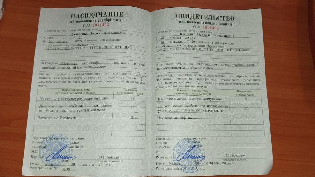 С 9 по 20 февраля старший преподаватель кафедры теории и истории государства и права Денисенко Надежда Вячеславовна прошла повышение квалификации по программе «Методика подготовки и проведения учебных занятий на иностранном (английском) языке». Повышение квалификации проводилось преподавателями Республиканского института высшей школы. В рамках программы был организованы занятия по методическим приёмам подготовки и проведения учебных занятий на английском языке, дизайну учебных презентаций, английскому произношению и устной речи, грамматическим основам современного английского языка, проектированию учебных занятий на английском языке. Повышение квалификации позволит внедрить современные методики в процесс преподавания правовых дисциплин иностранным студентам.